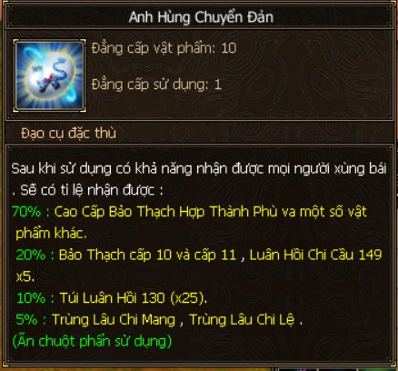 Phụng Minh Vương Lăng | Tổ đội 3 người trở lên, yêu cầu cấp 130 và hoạt lực đạt 5m. Gặp NPC ở Lôi Đài Lạc Dương để tham gia | Tiềm Năng Chân Đan +10000 điểm Bách Bảo Tinh Thạch Túi Luân Hồi x25 Anh Hùng Chuyển Đan Luân Hồi Chi Cầu 149 |